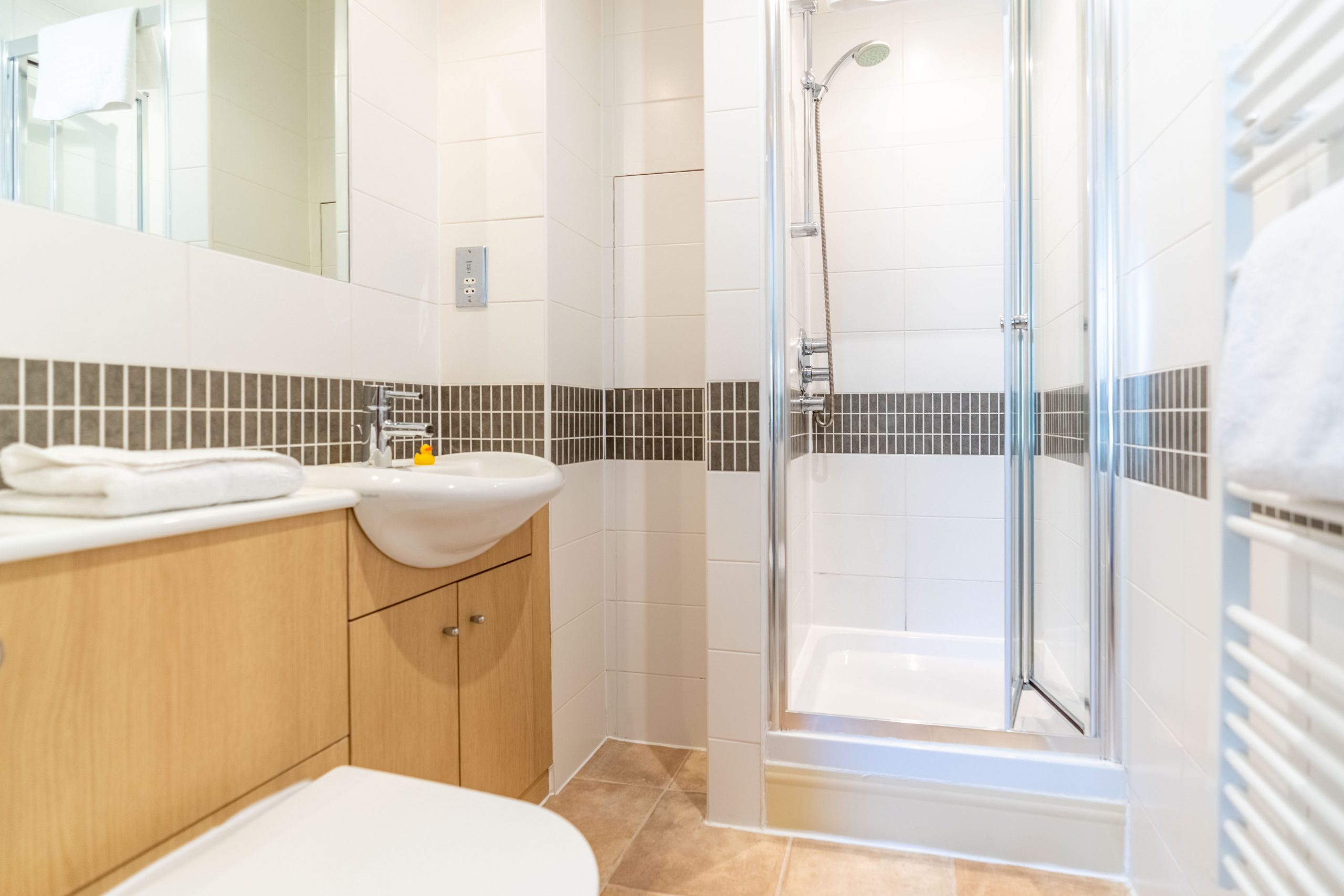 Each apartment features high-quality fixtures and fittings throughout. The fully equipped kitchens boast sleek built-in appliances and high-gloss cabinets, while the open-plan living and dining area provides a spacious and stylish environment for relaxation or work. The well-appointed double bedrooms include a TV for added comfort to the Master, as well as an en-suite bathroom with shower and a separate bathroom—complete with a bath and shower even include a rubber duck to add a playful touch to your bath time!